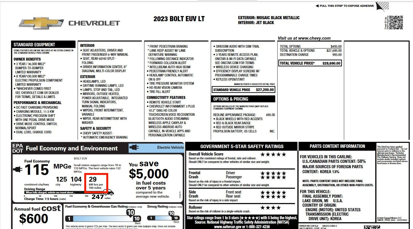 12,000 miles per year is 32.9 miles per day (12,000 ÷ 365), on average. Even a common 110V, 12 amp wall outlet can recharge that much driving in about 8 hours. I am going to assume the EV driver can plug in at home or at work. I fully understand that many drivers can’t, but if they can’t, there are lots of businesses that offer free Level 2 charging in order to attract customers. That 32.9 miles of driving could be recouped in a little over an hour. Yes, that’s not as convenient as charging at home or work, but it’s free. That being said, we’re going to base our calculations on someone who IS paying for the electricity, at their residence. The average price of a kilowatt hour (kWh) of electricity is 17¢ (it’s much cheaper in Texas, where I live). The EV we’re discussing is the Chevy Bolt EV which, according the the EPA section of the window sticker, can travel 100 miles on 29 kWh of electricity (see image below). That means it gets 3.45 miles per kWh (100 miles ÷ 29 kWh).