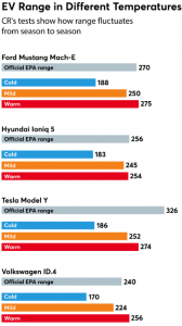 Am I upset? No, just a little disappointed. My original minimum acceptable range, when shopping for an EV, was 250 miles and the Model Y hit that, at highway speeds. I haven’t learned enough about the Model Y to know if anything I did contributed to the drop in range, but the chart seems to indicate my results are very similar to what others are seeing.