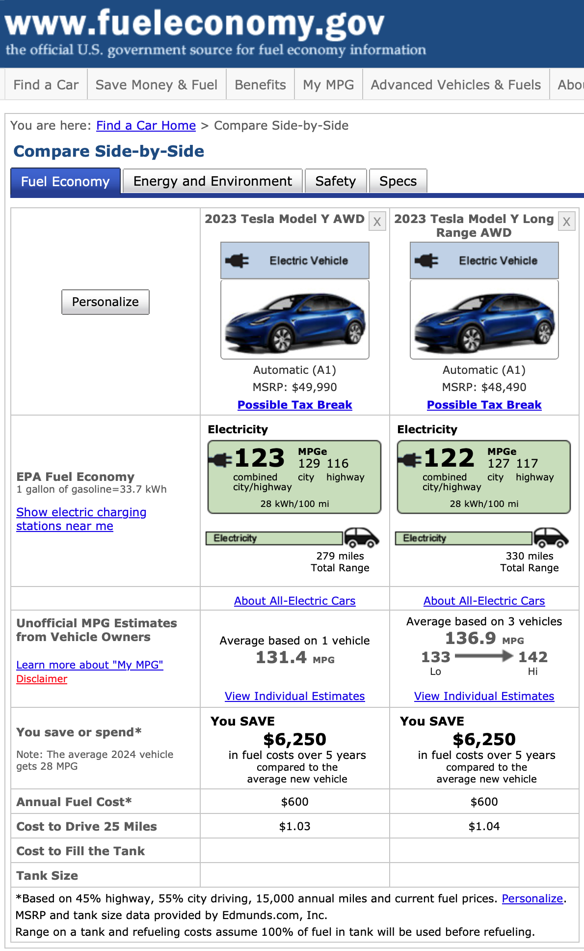 Whether those numbers are true in the real world, I have no way of knowing. Until I found the chart on the right, I thought it possible I had been given a standard range Model Y although even my Tesla app shows it to be the long range version. The chart at the bottom shows the two Model Y’s specs from the FuelEconomy.gov website.