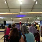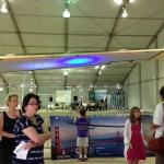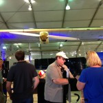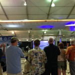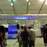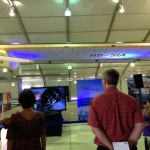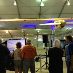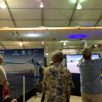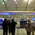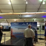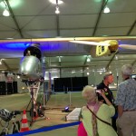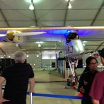 There were four propellers spaced along the wings and atop the wings, the entire surface as covered with solar panels. There were large television screens scattered along the length of the plane, all playing videos about it. In the rear of the hangar, there was a theater set up with additional video presentations running. But the best part, by far, was that every 30 feet or so, there was a Solar Impulse team member available to answer questions. And answer they did! Everyone seemed to have tons of questions for them. Some of them would complain that their English wasn’t very good, but I thought they communicated very well and could understand them over the noise of others talking, video programs running and the general hubbub.