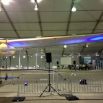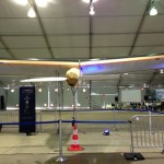 I had expected the wings to be oriented parallel to the side of the tent with “Solar Impulse” written across it. The wingspan was far too long to do that. The tips of the wings were not very far from each end of the tent. My first impression was that the plane is much sturdier than I had anticipated the fuselage, at the center of the plane’s wings, had a pretty packed-looking cockpit which didn’t look very comfortable at all. (but I would have loved to sit in it nonetheless…)