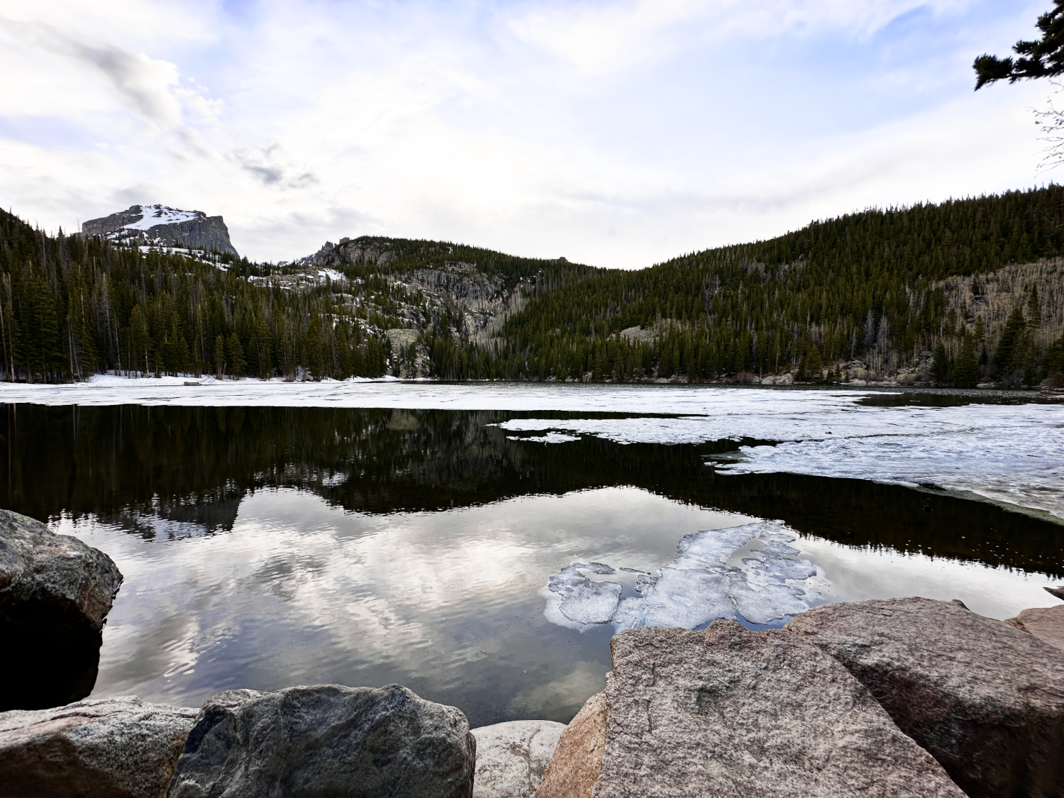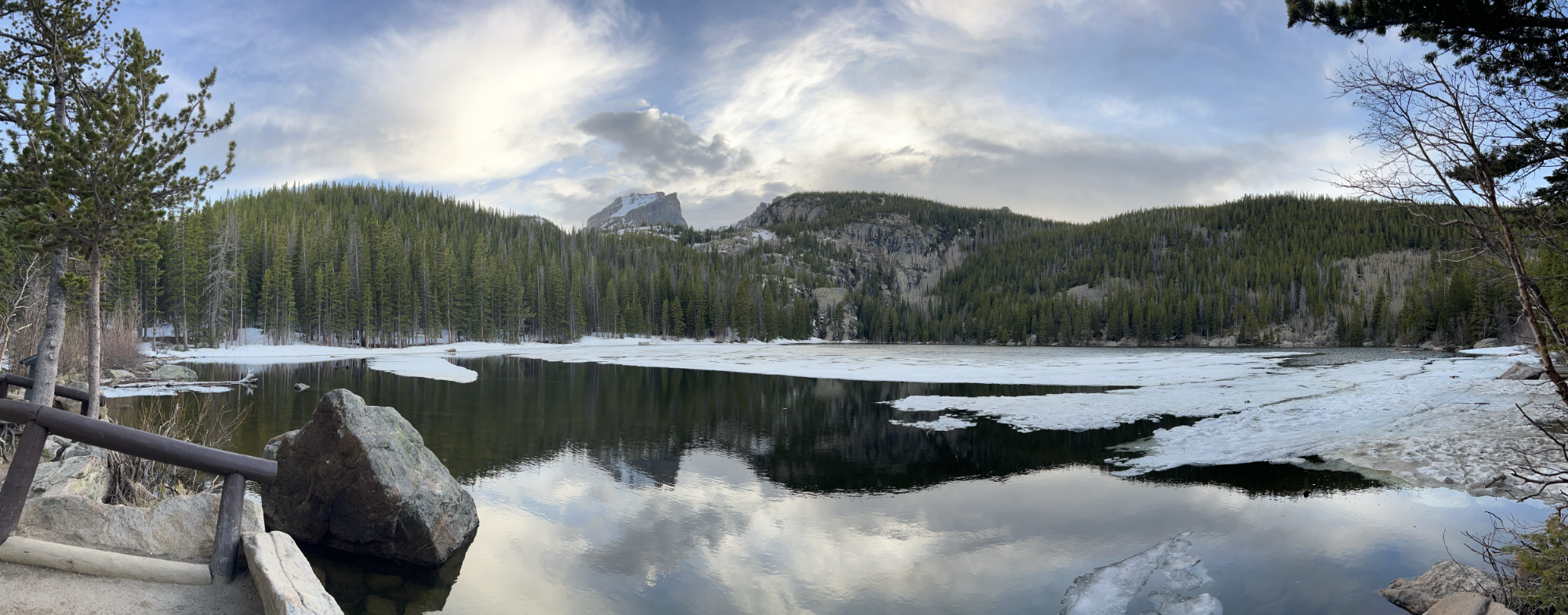 We arrived at our campsite a little ahead of schedule around 6PM. We put up the tent, offloaded some of the gear in the car and took a quick drive up to Bear Lake, just to see if the parking lot there was as crowded as it is in the summer (it wasn’t, so we parked). There was still ice on part of the lake’s surface and snow in mounds on the trails. Looks like it’ll have been a smart move to buy spikes to strap onto our hiking boots.