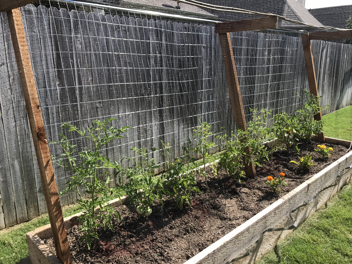 On Earth Day Sunday, as we started our morning, Bonnie mentioned trellis-training her tomatoes to get more production out of each plant. I was in the mood to design, so I started putting together a trellis plan for one of the beds. (We decided against trellises for both beds, as the southernmost bed’s trellis would eventually cast shade on the northernmost bed.