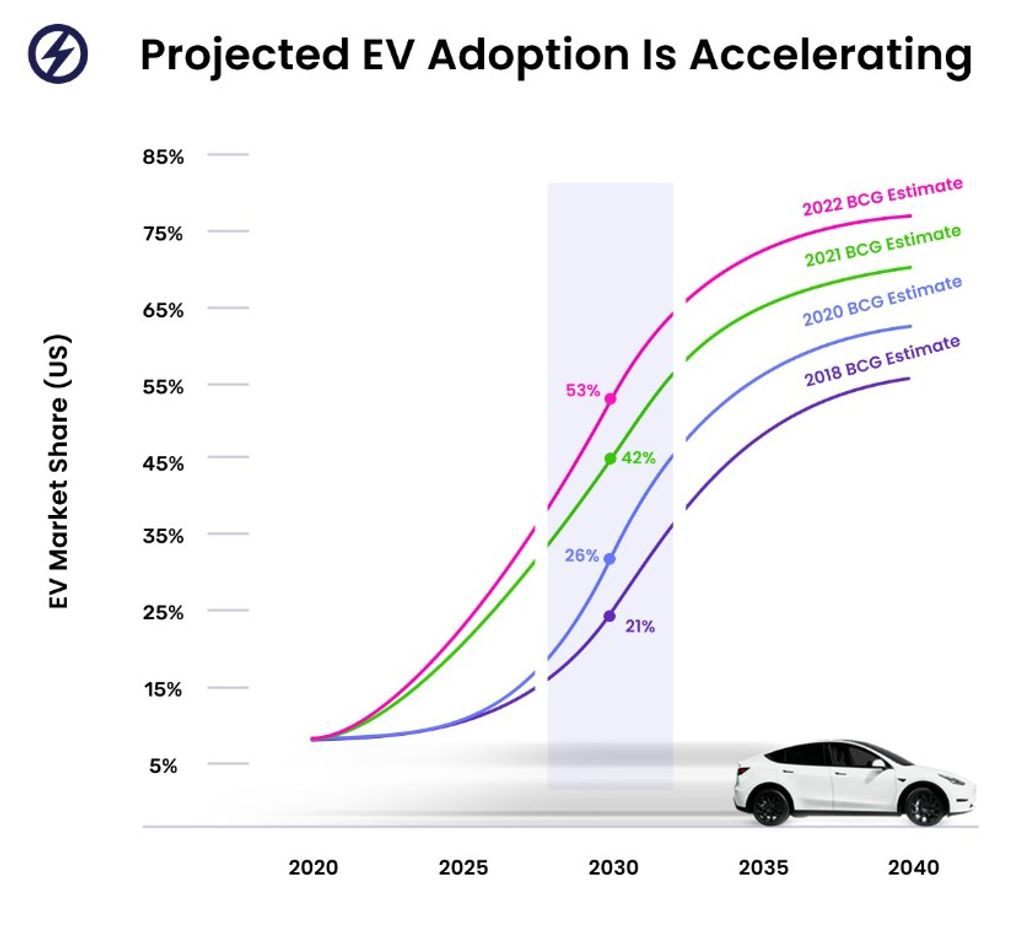 Once we get past the early adopter stage (green area in chart), sales pick up dramatically, as shown in the image above. In my opinion, we are now in the post-early adopter stage and sales are showing the acceleration in adoption I’ve been predicting, but here’s the really interesting part: Actual sales results as well as multiple projections, based on sales, keep going up as newer and newer data becomes available. In other words, the projections for adoption have also accelerated. The chart below shows projections by Boston Consulting Group that were published over the years 2018 to 2022. Every newer projection shows a remarkable increase over BCG’s own previous projections. The results (sales) keep improving beyond expectations to improve estimates for the future. Interest in, and optimism for, EVs keeps growing!