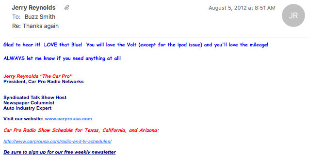 this morning, I was going through some old emails and found a reminder of how my electric vehicle journey began. It all started with me reaching out to Jerry Reynolds of Car Pro Radio Networks to ask advice. He had given me great advice before, so I was going back to the well.