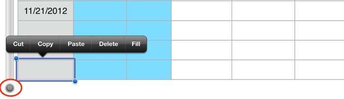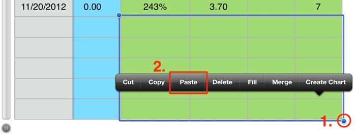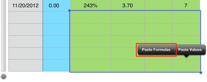 • Once the new rows are added, you just need to paste the formulas into the new green cells. Tap the upper-left green cell of the rows you just added.  Once again, a selection rectangle will appear around that cell with a list of commands. Ignore the commands and (1) drag the ‘handle’ on the bottom-right of the selection rectangle down and to the right, to select the all the green cells of all the rows you just added. Once all the cells are in the selection rectangle, (2) tap on the “Paste” command.Select the cells that don't have formulas yet