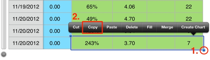 • When you add the new rows, there won’t be any formulas in the green cells of the new rows. Due to this, when you enter data in the blue areas, the green areas will stay empty. To fix this, tap the left green cell in the bottom row of your spreadsheet. A selection rectangle will appear around that cell with a list of commands. Ignore the commands and (1) drag the ‘handle’ on the bottom-right of the selection rectangle to the right, to select the entire green area of the bottom row. Once all four cells are in the selection rectangle, (2) tap on the “Copy” command.Copy formulas from the last row