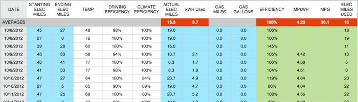 Almost every time I get into my Volt, I enter data into my iPad or iPhone in a Numbers spreadsheet to track my Volt’s performance. Mainly, I am doing this for two reasons, a) to see how temperature affects my mileage and b) to see if my projected savings (and therefore, cost justification) were either optimistic or pessimistic.