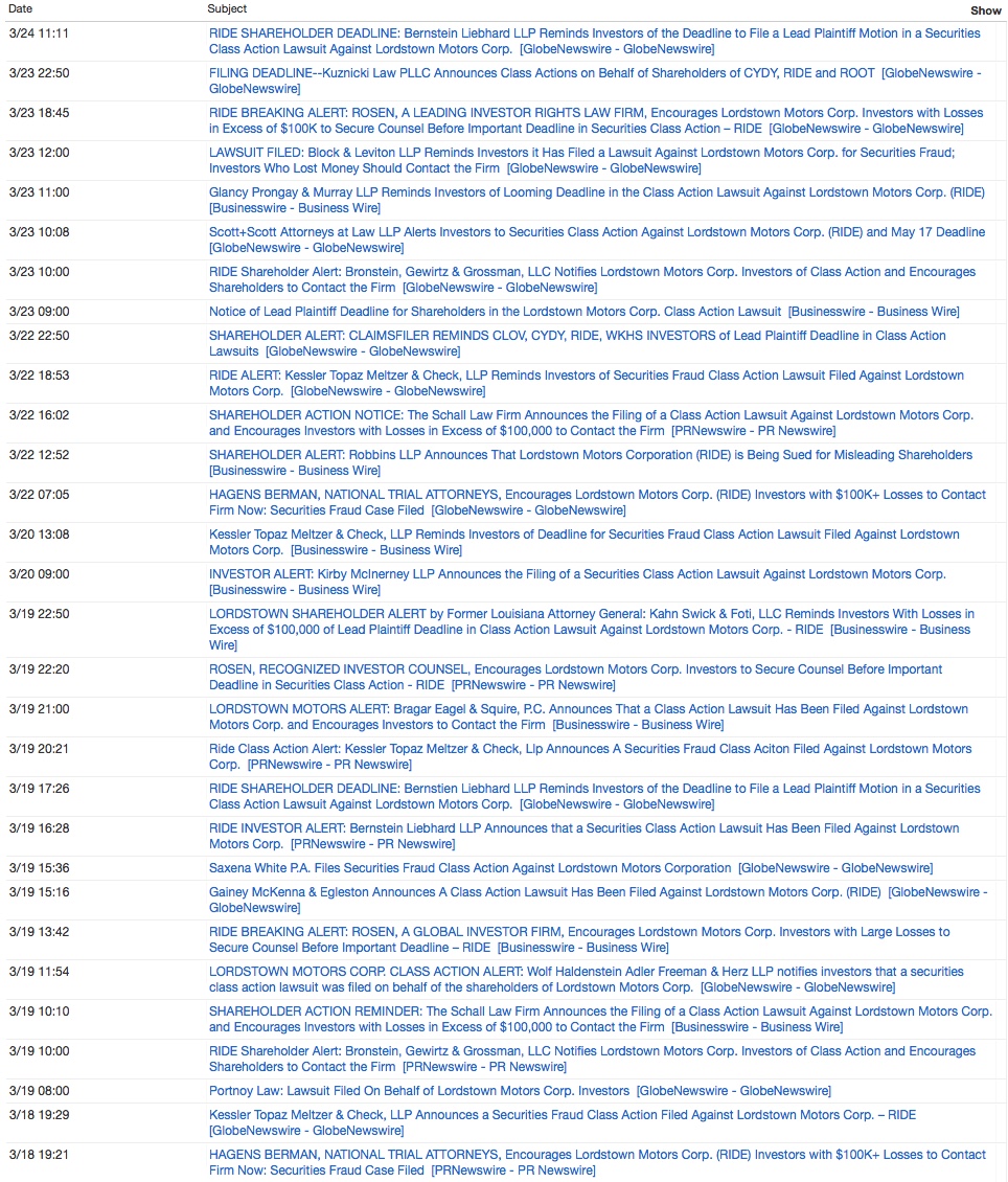 If there has been some malfeasance, on the part of Lordstown’s executives, I hope it is rooted out and remedied, but for the sake of the workers in the area, I hope it’s not true. The workers in Ohio need a break, and producing the first electric pickup truck to hit the roads of the U.S. could be a boon to them. I’m tired of short-sellers betting against U.S. companies, like Tesla Motors, GameStop, Nikola Motors and now, Lordstown. I understand it’s just a way to make a living, but it seems so parasitic and it is so much easier to tear down than to build up. Knowing the litigious nature of our society, I have to hope the funds that were slated to get the Endurance to market doesn’t get spent fighting lawyers, but based on Newswire listings of Lordstown articles, I’m concerned (see below).