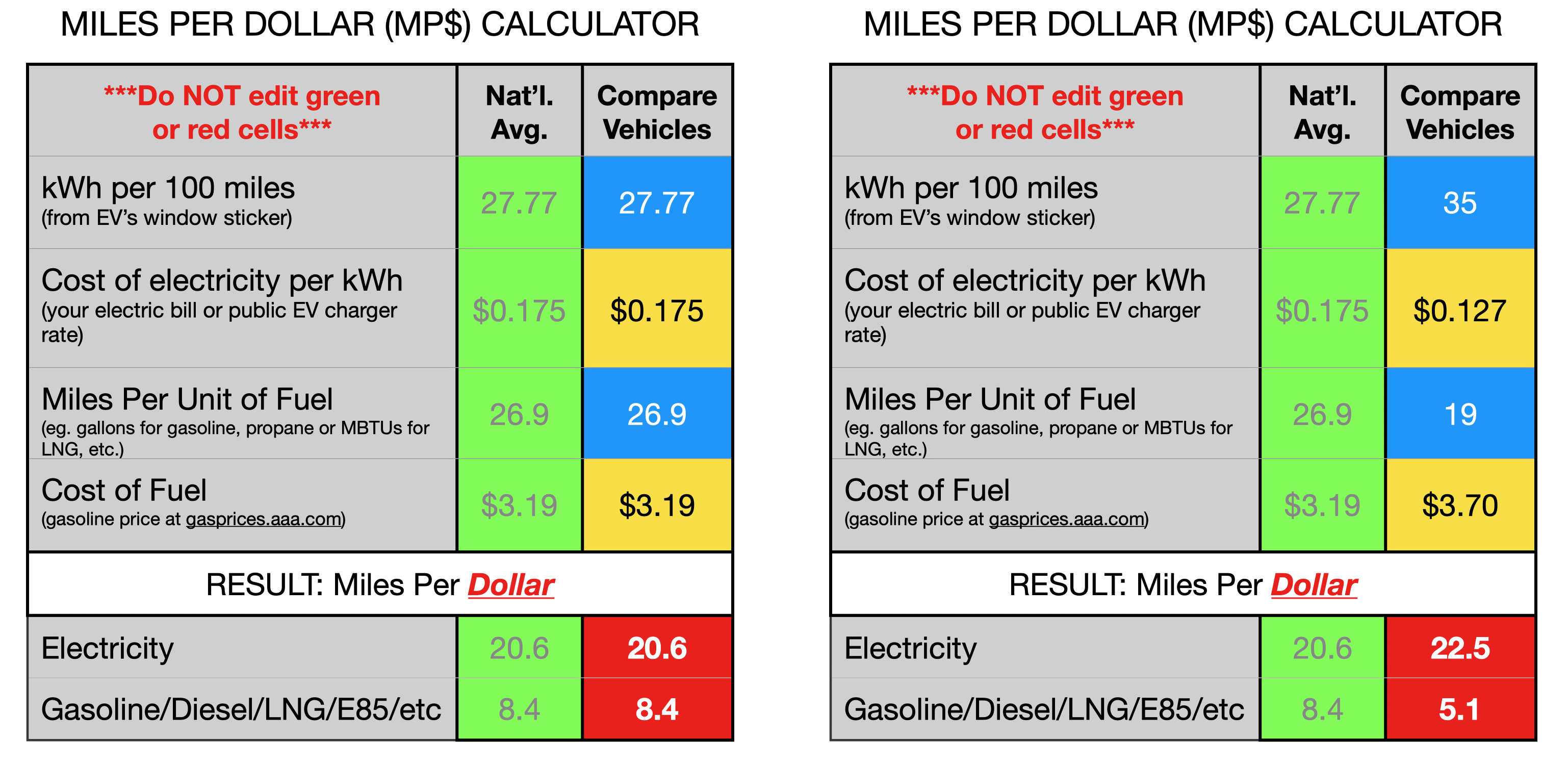 Notice the left version of the spreadsheet has an MP$ of 20.4 miles for the EV versus 9.4 miles for the ICE vehicle. The right spreadsheet has an MP$ of 20.4 miles for the EV versus 5.1 miles for the ICE vehicle. The difference was the ICE vehicle and cost of its fuel. In both examples, the EV was a Chevy Blazer EV. In the left spreadsheet, the ICE vehicle was a sedan that was rated at 30 MPG and used regular gasoline. In the right spreadsheet, the ICE vehicle was a pickup that was rated at 19 MPG and used diesel.
