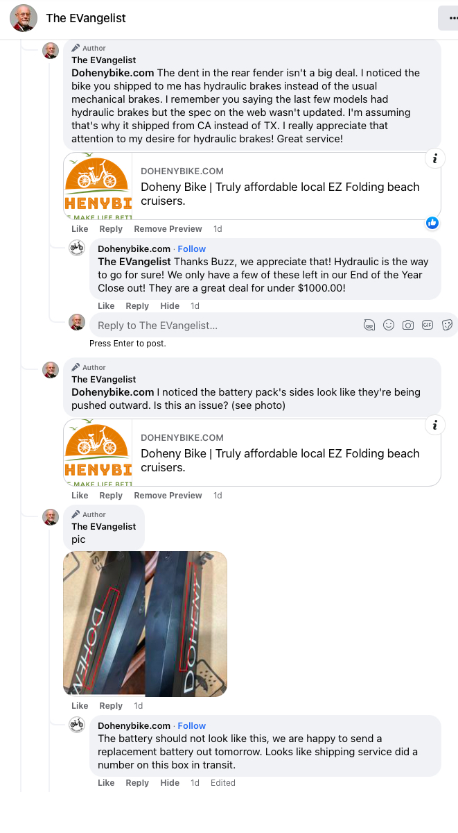 As I carefully unpacked the Cruiser, I noticed a dent in the rear fender, but figured I could live with it. I also found that they included all the tools required for assembly! Unfortunately, I noticed the battery pack appeared to be bulging and became concerned about a fire hazard, if the battery was actually damaged. I decided to reply to the rep’s Facebook comment to post photos of the battery issue and ask about it. Here’s the conversation with the battery pics (click on conversation to see larger image of battery bulge):
