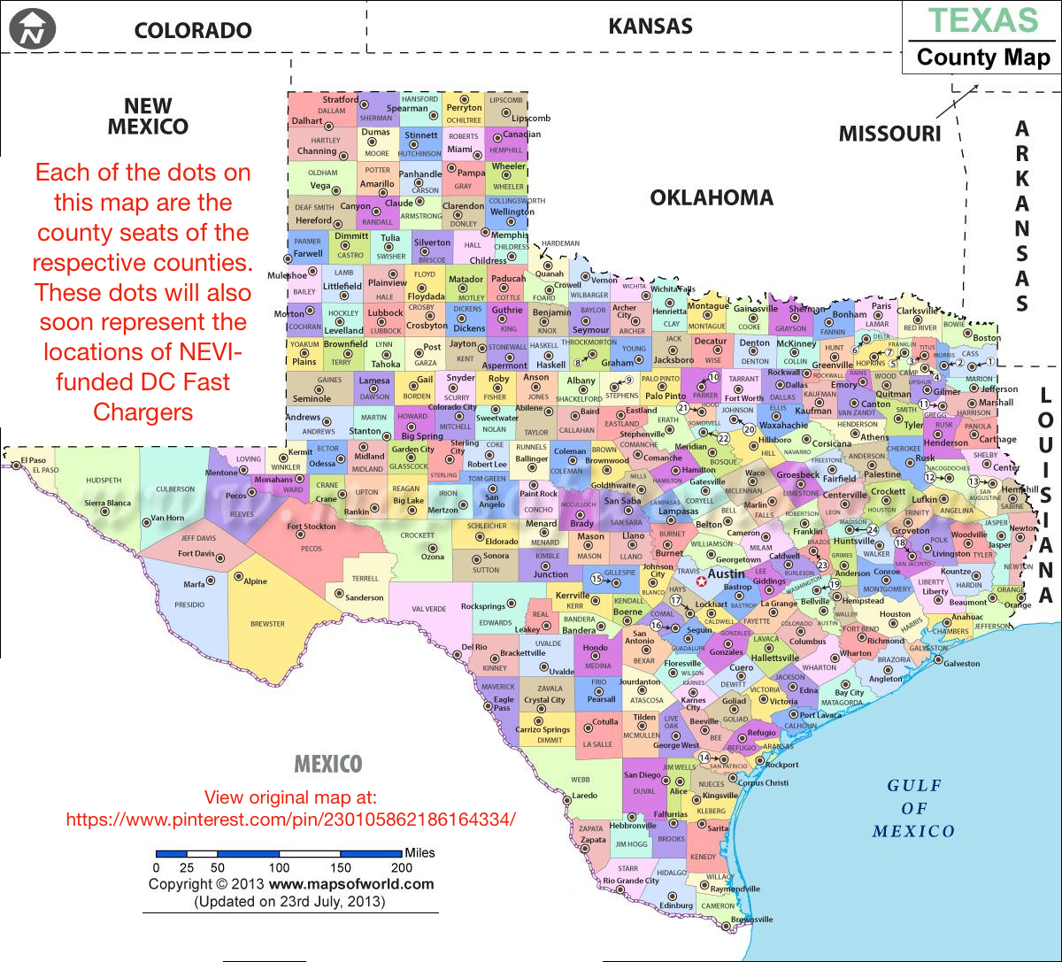 The state of Texas has already started installing DC fast chargers (DCFC), using the National Electric Vehicle Infrastructure (NEVI) program. Phase one of the Texas rollout will install DCFC every 50 miles along our interstate highways. After that, the program moves to rural areas with DCFCs planned for every county in the state, probably located in the county seat of each county. (click on the map, to the left, for a larger version with the county seats marked)