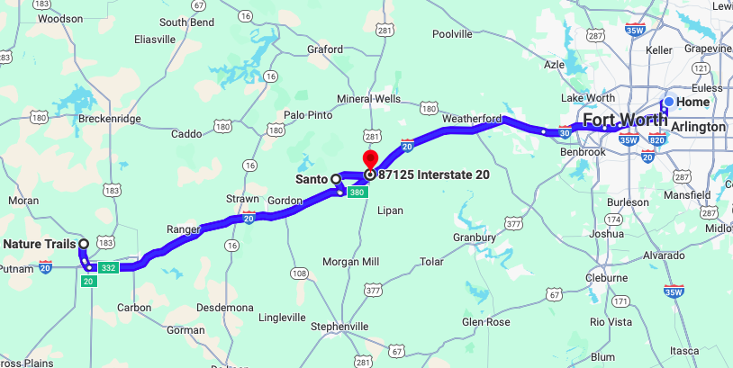 The trip was a relatively short one, so we could learn what kind of real-world range we could expect in our new EV. Our Model Y is the Long Range AWD version, with an EPA rated range of 330 miles. Of course, we expected less than that, since most of the drive would be at speeds of 70-75 MPH, but the temperature outside was 60℉, so we thought we’d do pretty well. The planned round trip was 238 miles. Although we weren’t sure if we needed to, we checked for Tesla Superchargers along the route and found a couple banks, one in the town of Cisco and one between our home and our destination, about 65 miles from Cisco, in Santo, Texas. (see map above)