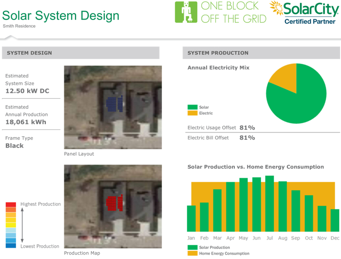 The final proposal was an interesting change. About three months had passed since the first proposal and we were surprised to see the array had been moved to only the East- and West-facing roof slopes but was guaranteed to produce even more energy! (18,061 kWh vs. 17,576 kWh) No explanation of how this was achieved was given to me, but my conclusion was that a newer generation of more efficient panels was used on the second design.