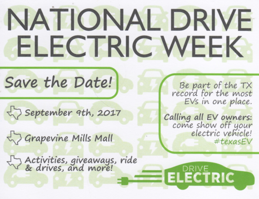 It’s that time of year again: It’s National Drive Electric Week! Well…actually, it starts on September 9th and goes through the 17th. As bookends to the week, I will be at the NDEW2017 gathering at Grapevine Mills Mall on Saturday, September 9th. Form 10:00AM until noon, there will be a gathering of plug-in vehicle owners, supporters and the EV-curious. It’s a;ways a good time and I’ll have the Chevy Bolt EV and Volt with me.