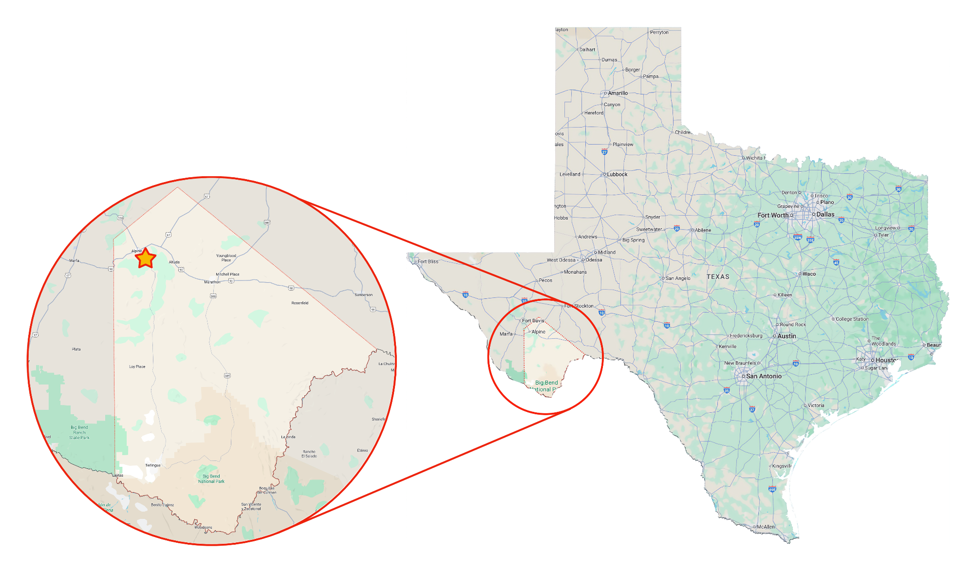 Terlingua and the entirety of Big Bend National Park, are located in Texas’ largest county, Brewster. It is 6,192 square miles of beautiful desert, mountains, and canyons populated by just 9,508 people. Its legendary status for Texans has always interested me, but more important was its location. It sits on a road that starts at the only bank of DC fast chargers in Brewster County (the star in Alpine, below), loops around Big Bend Ranch State Park (a much larger park than the national park… of course), through Marfa (of “Marfa Lights” fame) and finally back to Alpine. That 235 mile loop has a speed limit that varies between 75 and 85 miles per hour and is in a mountainous area, making it even more challenging. That route is shown in red in the image above.