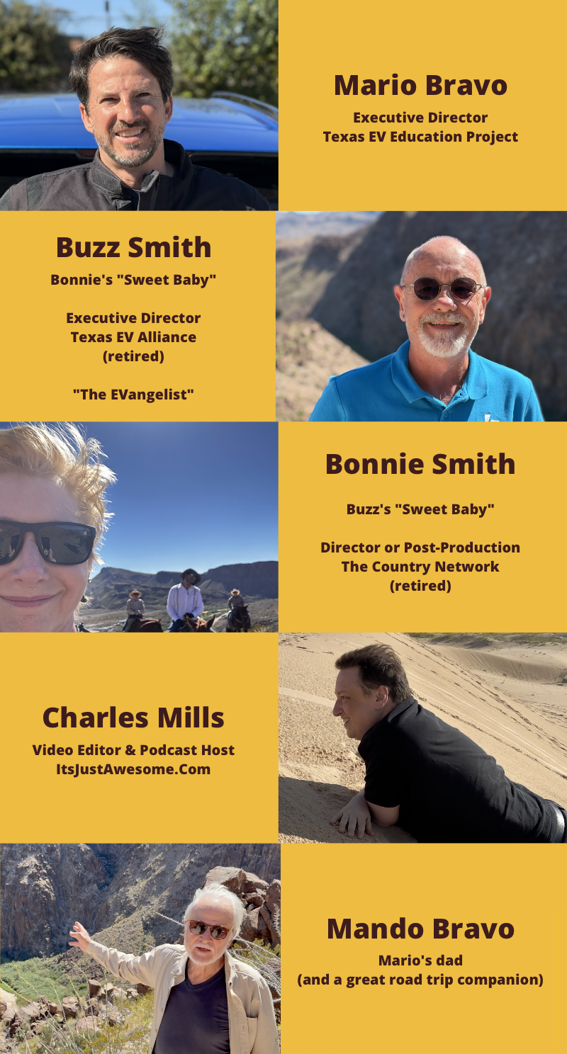 Unfortunately, our usual road trip companion, Amanda (the Director of Administration at Texas EV) could not go with us, due to a prior commitment. Obviously, a documentary would require multiple people shooting stills & video, so we needed to fill the void with a road crew. One was an obvious choice for me, my wife Bonnie. As fate would have it, I married the woman who would become the Director of Post-Production at The Country Network and work in video production her entire career. Next, I thought of my good friend Charles Mills. Charles is a former Apple “Creative” with whom I worked and he taught video editing in our Apple Store. As part of that job, he would create team-building and special event videos for the store. Early on, he recruited me to act in his videos and we’ve been making short films together ever since. Check out his podcast: It’s Just Awesome. These days, he works in a large hospital, making video productions for their internal use.