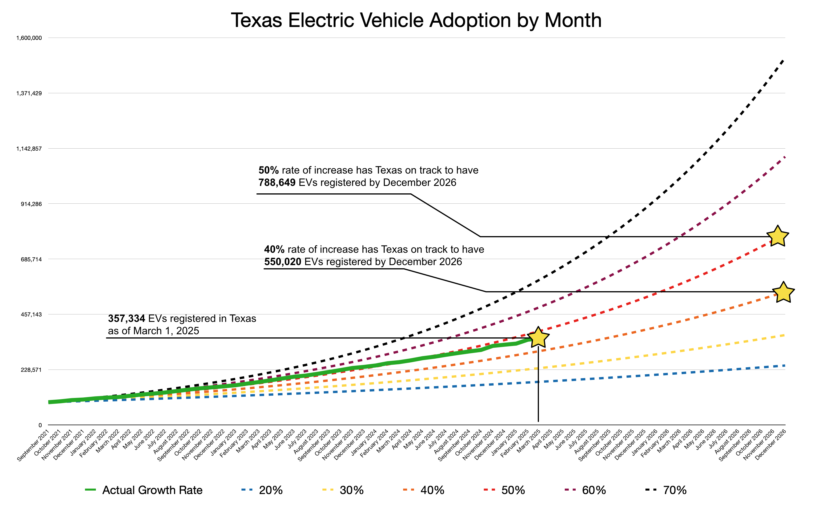 Recently, I posted about how EV adoption, over time, seems to be mimicking cell phone adoption in the 1990s. Can you imagine if politicians had decided they were opposed to cell phones back then and campaigned on ending their existence in the U.S.? The world would be so much different today, than it is, for good or bad. Bloomberg and other publications have mentioned the possible problem for politicians taking such a stance. EV adoption, although weakened by high auto financing rates, continues to be strong. In Texas plug-in vehicle registrations increase year-over-year at close to 50%. The “rule of 72” shows that this growth doubles the number of EVs on the road approximately every 1.44 years. There are currently 290,716 plug-in vehicles registered in Texas. In a year and a half, there will be more than 581,000. Some areas of Texas are increasing at a rate of 70%+, year-over-year. In those areas, EVs will double in number about every 12 months!