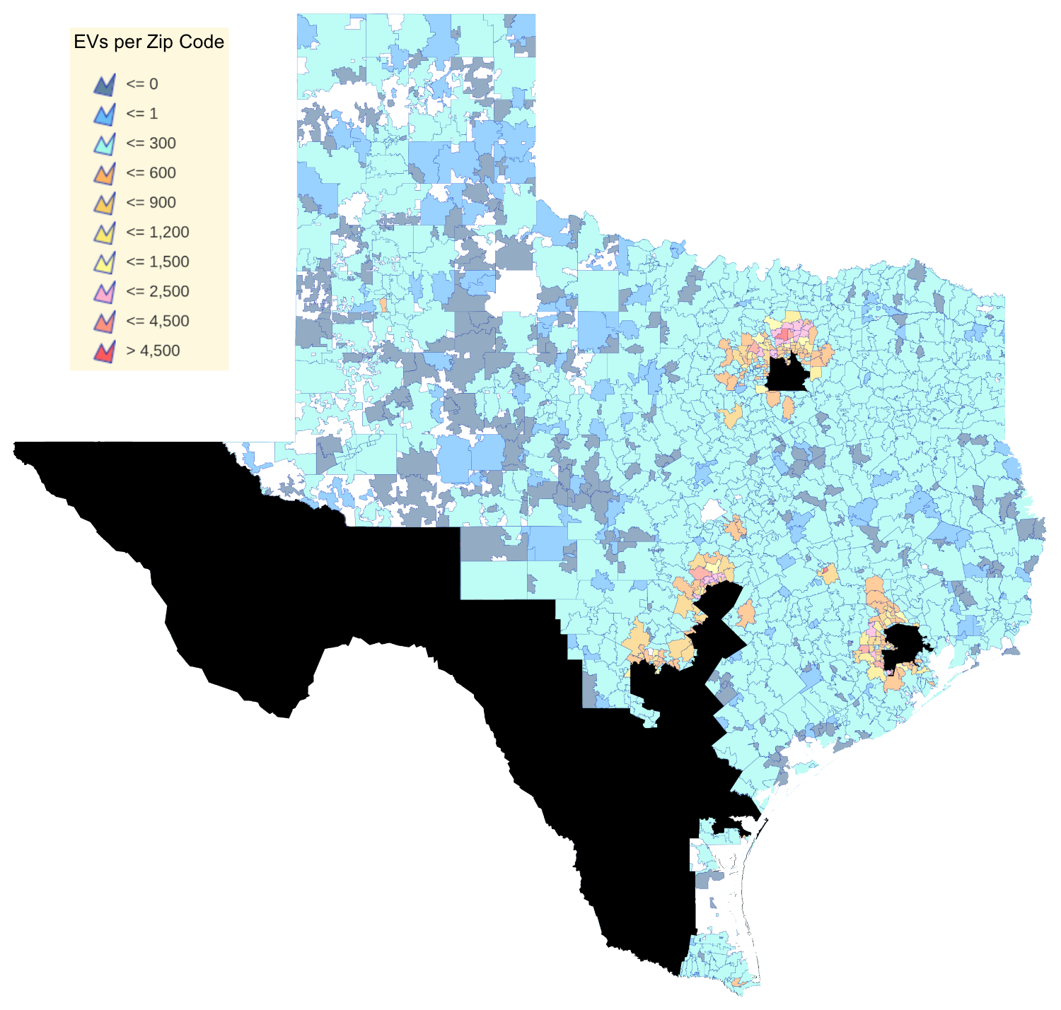 Another common myth is that drivers decide to become EV buyers because of climate change or other environmental concerns. The map below shows areas of noncompliance with EPA air quality standards. Some of these areas have been in noncompliance for decades. However, there is heavy EV adoption occurring in areas with relatively clean air, like Austin, Tyler and College Station as well as moderately heavy adoption in areas near Lubbock, Longview, Waco, Texarkana, Amarillo and more.