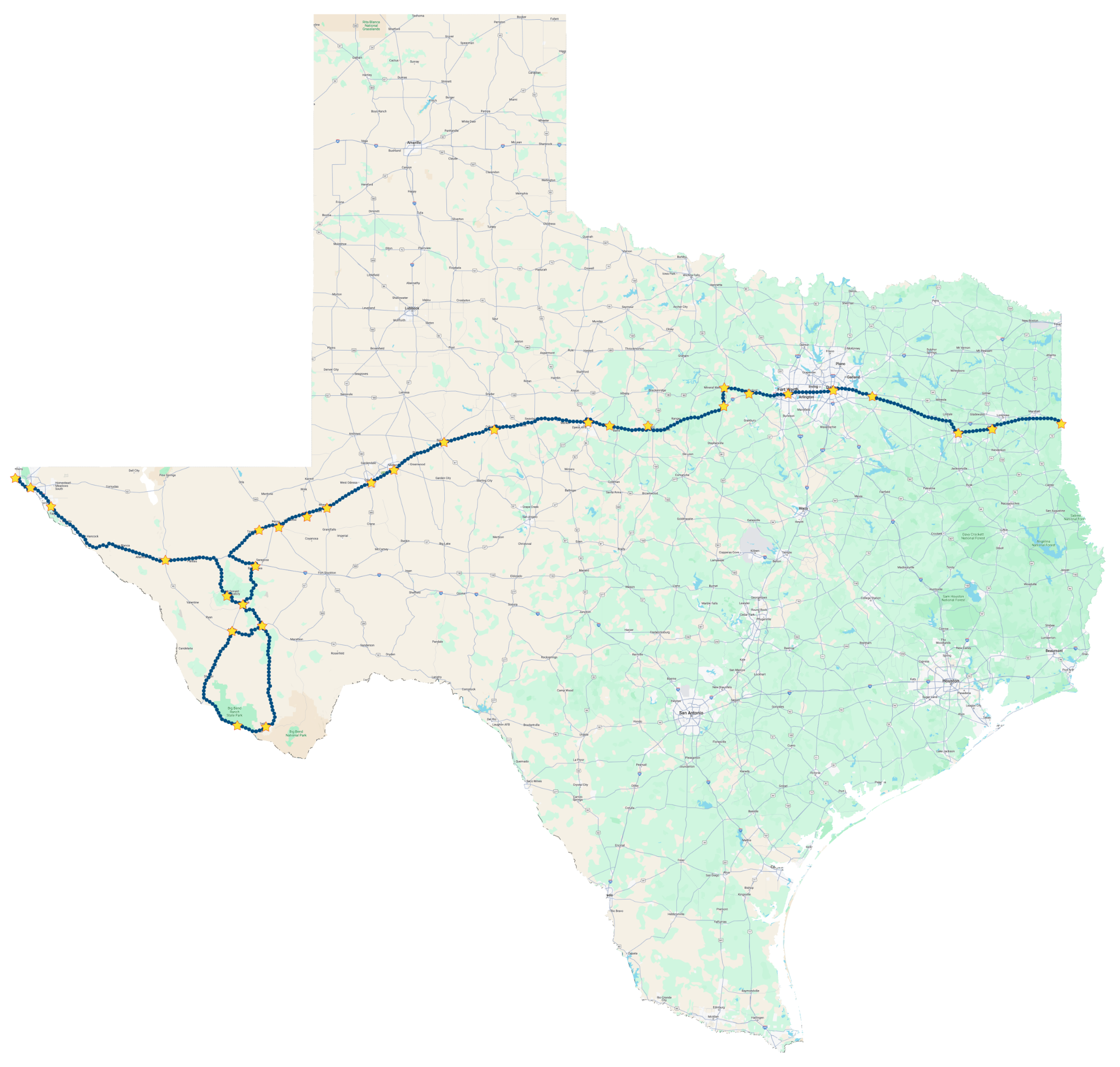 We’ll head to Shreveport, Louisiana the night (October 21st) before and will enter Texas at Waskom on I-20. We’ll continue along I-20 to where it meets I-10 west of Balmorhea. From there, we’ll continue down into Big Bend Country, where there are very few EV charging facilities.