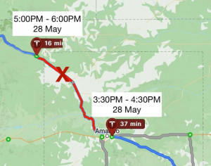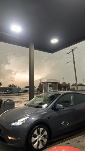 The drive continued uneventfully to our next charging stop, In Amarillo. Again the arrival time was almost exactly what we had predicted on the route map, published a week or two before leaving. While walking from the car to the convenience store, we were stopped by a guy asking if we’d seen the weather radar. We had been noticing growing dark clouds to the west, but since we turn north at Amarillo, we hadn’t paid them much heed.