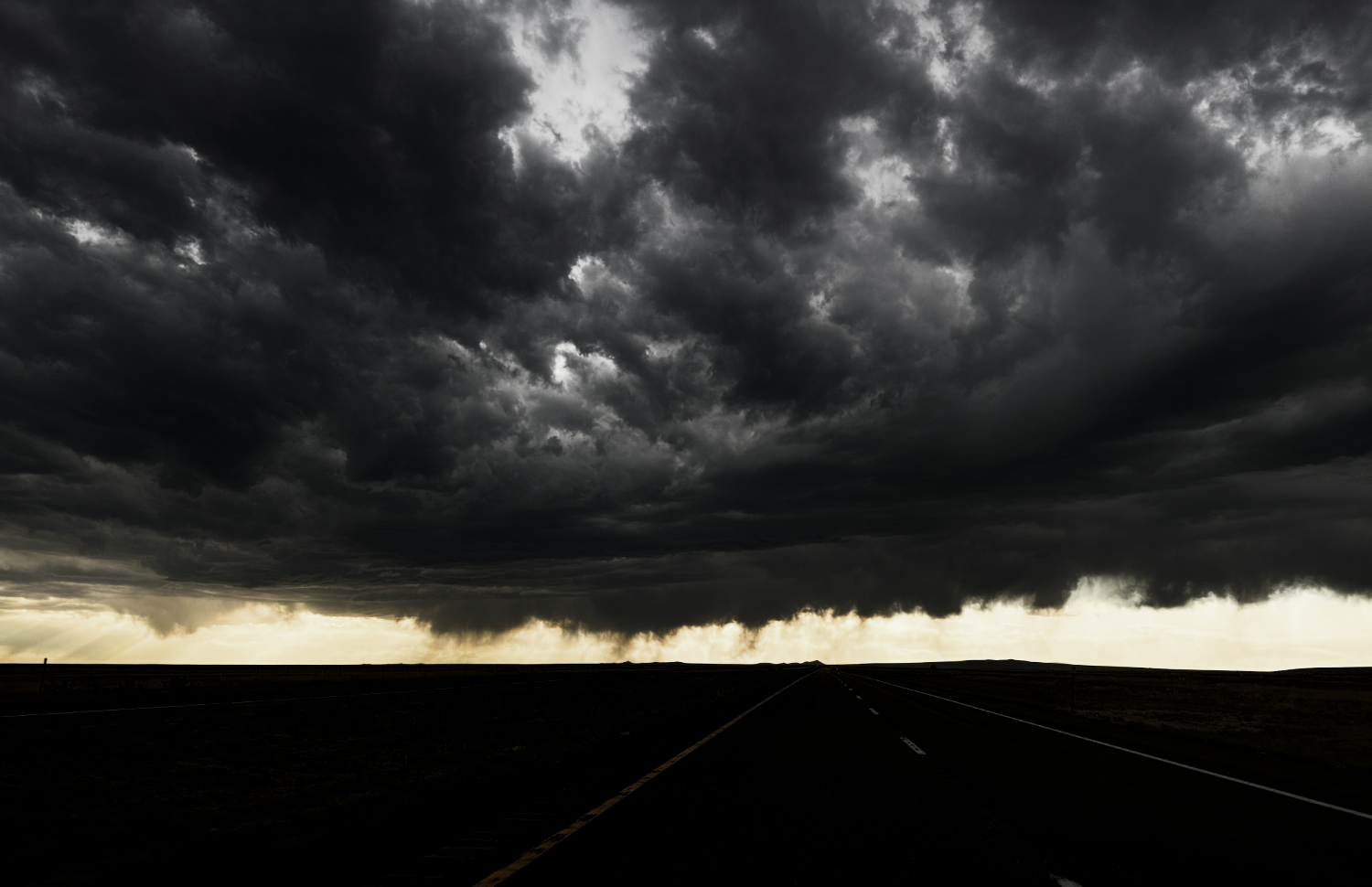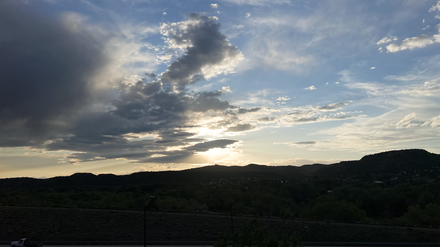 As we approached Clayton, we could see the light of the sun between the horizon and the dark cloud above us. We were almost out. When we got the the grocery store in Clayton, we decided to charge for just ten minutes and head to Trinidad, our hotel and some much needed sleep. There were Mammatus Clouds that looked amazing.