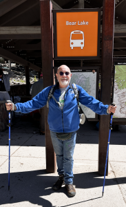 After the scattering, we drove back to camp and got ready for our first hike. We knew some of the hike had snow that was slippery, so we included boot spikes and trek poles in the equipment. We decided to take the transit bus to Bear Lake and hike back to our campsite, which is mostly downhill. Coincidentally, our campsite was located at the head of the trail we would be taking, the Glacier Creek trail.