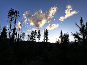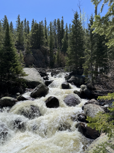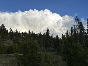 Day 3 started with a somber note. My mom passed away in November 2021. Her remains was cremated and divided among her three sons. She loved Galveston, but scattering of ashes is not allowed there. I have been struggling with where to scatter her ashes when this trip came up. She absolutely loved Rocky Mountain National Park. My mom and dad started bring us to the park around when I was 8 years old. We always stopped at the head of Moraine Park to look down the valley at snow-covered Stones Peak. I did not know scattering of ashes was permitted in national parks, but stumbled across the web page where you fill out a request. I submitted my request for scattering on Eagle Cliff mountain, which slopes down to Moraine Park. At a relatively early hour, for privacy, Bonnie and I scattered mom’s ashes among a circle of stones I found on the ground, looking right down the valley. I think she’d be pleased with the spot we selected. On the way there, I listened to Shake Russel’s song, “Sing Something Pretty for Me.”
