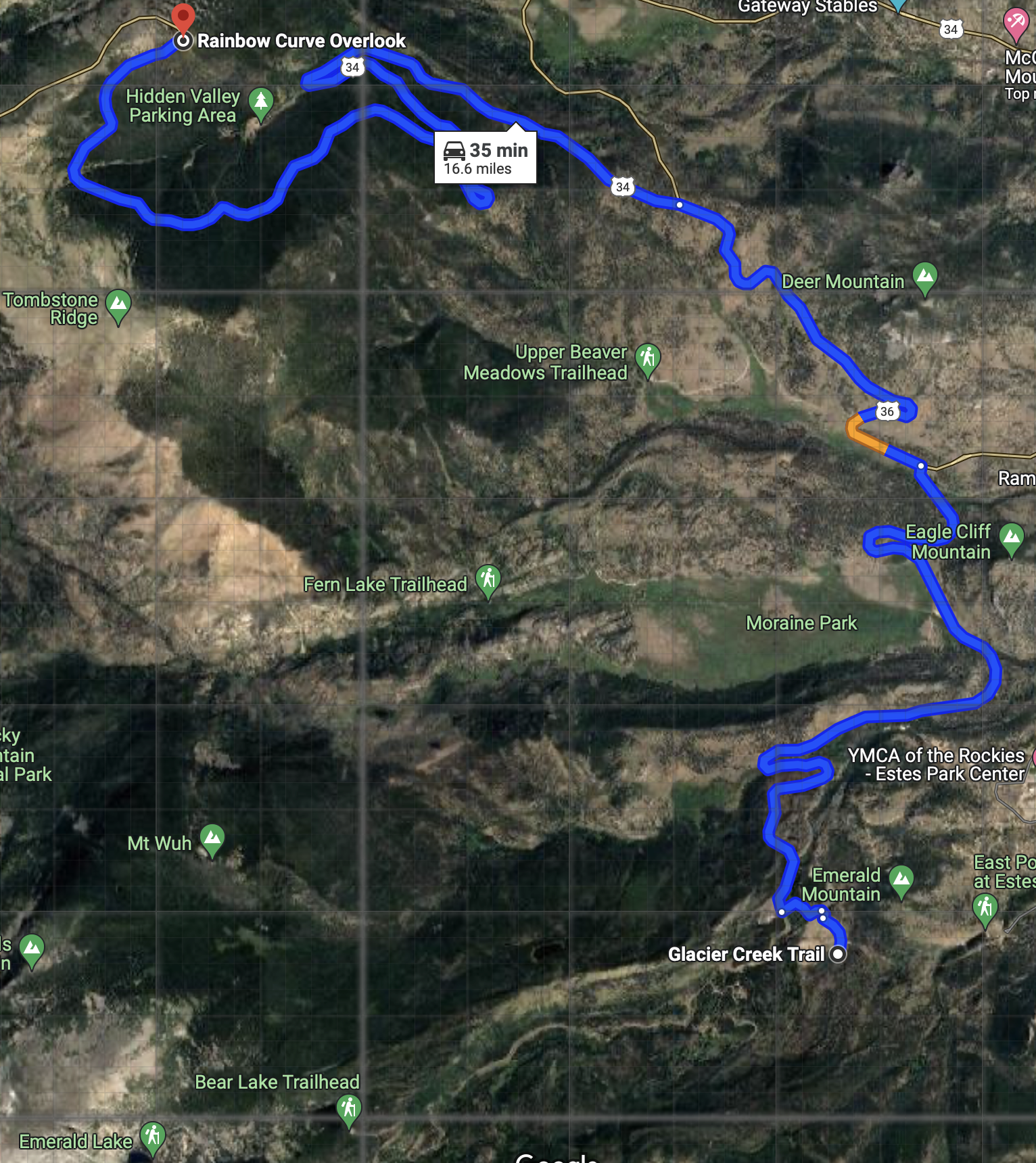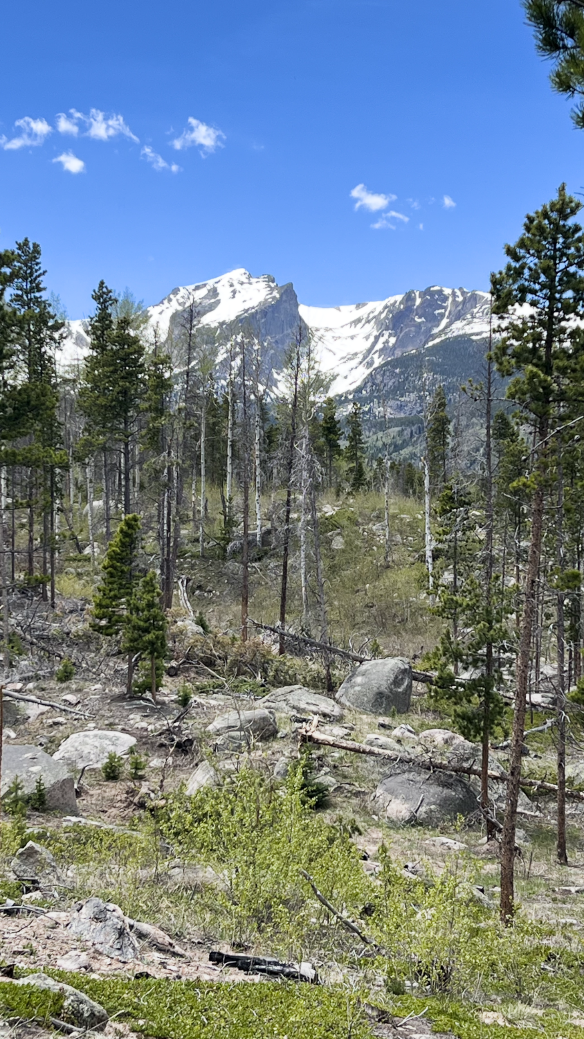 Day 3 started with a somber note. My mom passed away in November 2021. Her remains was cremated and divided among her three sons. She loved Galveston, but scattering of ashes is not allowed there. I have been struggling with where to scatter her ashes when this trip came up. She absolutely loved Rocky Mountain National Park. My mom and dad started bring us to the park around when I was 8 years old. We always stopped at the head of Moraine Park to look down the valley at snow-covered Stones Peak. I did not know scattering of ashes was permitted in national parks, but stumbled across the web page where you fill out a request. I submitted my request for scattering on Eagle Cliff mountain, which slopes down to Moraine Park. At a relatively early hour, for privacy, Bonnie and I scattered mom’s ashes among a circle of stones I found on the ground, looking right down the valley. I think she’d be pleased with the spot we selected. On the way there, I listened to Shake Russel’s song, “Sing Something Pretty for Me.”