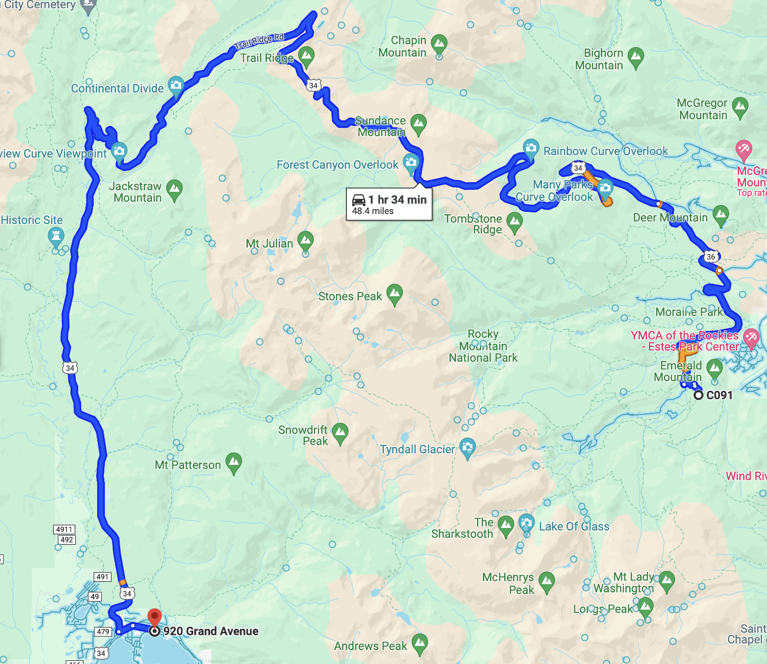 The distance from our parking spot in Grand Lake to our campsite in Glacier Basin was 48.4 miles. How would the strain of climbing and the regeneration, during descent affect our range? Our remaining range was 112 miles and at the end of the drive, we had 70 miles of range remaining. We used 42 miles of range to travel 48 miles. In other words, the ascent and descent caused our range to be impacted as if we were on level pavement (or going slightly downhill). The elevation of Grand Lake is 8,439 feet above sea level and our campground is 8,500 feet above sea level. The highest point along Trail Ridge Road is at an elevation of 12,183 feet. The range measurements were made going from Grand Lake to. our Glacier Basin campsite.