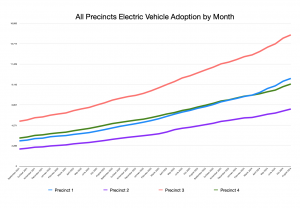 Since TxETRA’s 501(c)(6) lobbies the state government on EV policy, I’ve been particularly bothered by the politicization of EVs. EVs are not partisan! The data and maps have allowed me to show that EV adoption started in areas of higher population, usually in conservative electoral districts and spread from there. Adoption is starting to accelerate in rural areas, starting in the more populous areas, first. The purpose of my work is to show our elected representatives what’s been happening, quantitatively, in their districts.